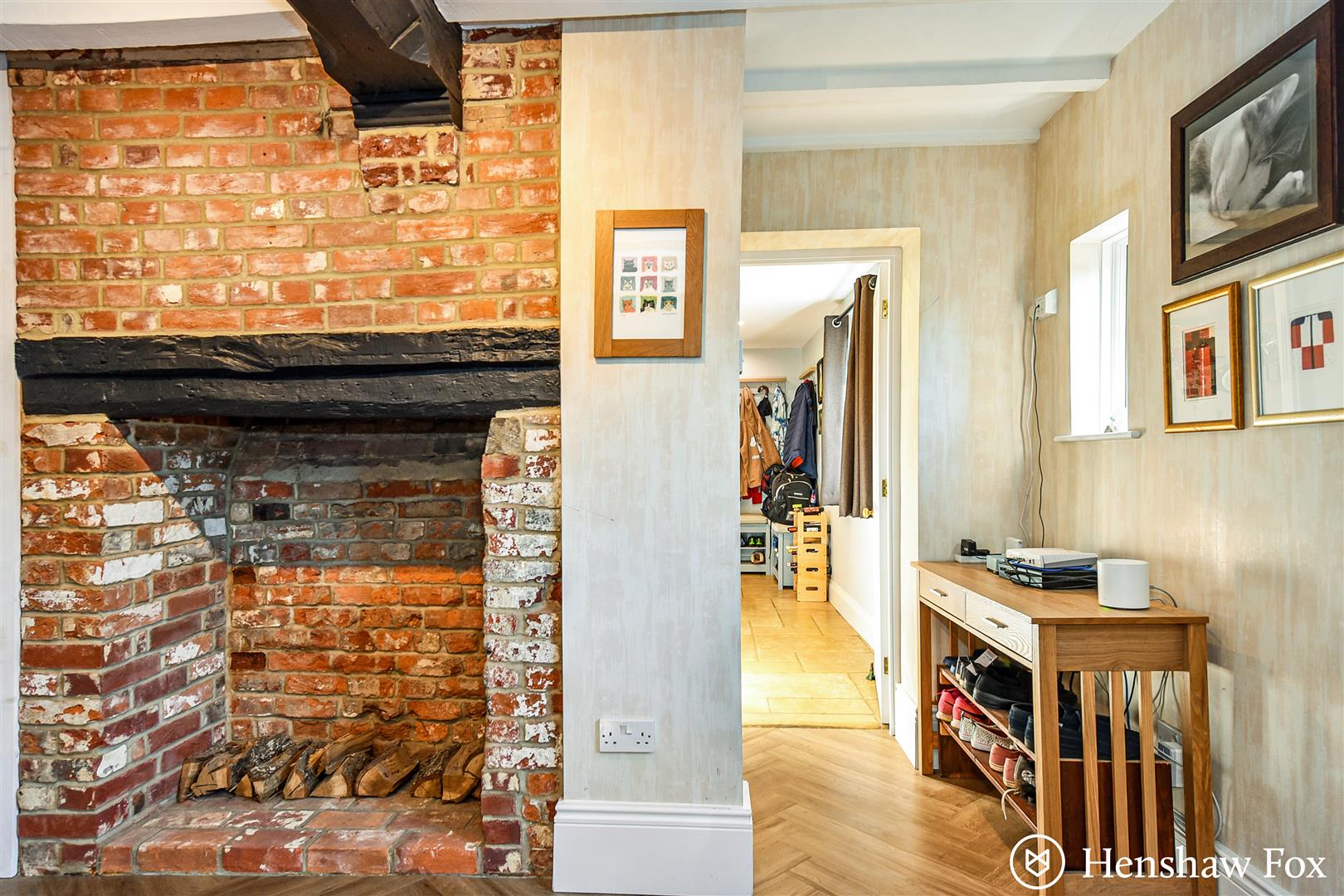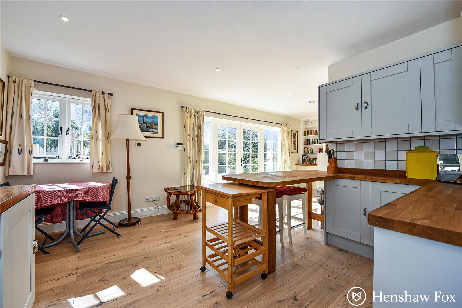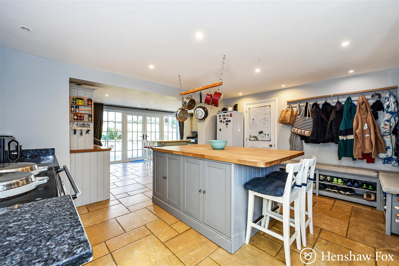 The welcoming entrance offers space for coats and shoes, fitted with quality oak effect flooring extending into the spacious dining room with feature beams and exposed brickwork. The cottage style kitchen breakfast room is flooded with light from three aspects and offers an extensive range of shaker style wall and base units with with oak and granite worksurfaces and two feature islands. Integrated appliances include an electric Aga, single oven with induction hob and extractor over, dishwasher and ample space for freestanding white goods. A family room houses the utilities cupboard with plumbing for white goods and overlooks the gardens via French doors. An inner lobby accesses a cloakroom and wc and leads to the dual aspect sitting room which features an open fireplace with bespoke fitted storage and shelving with access to the garden via French doors.