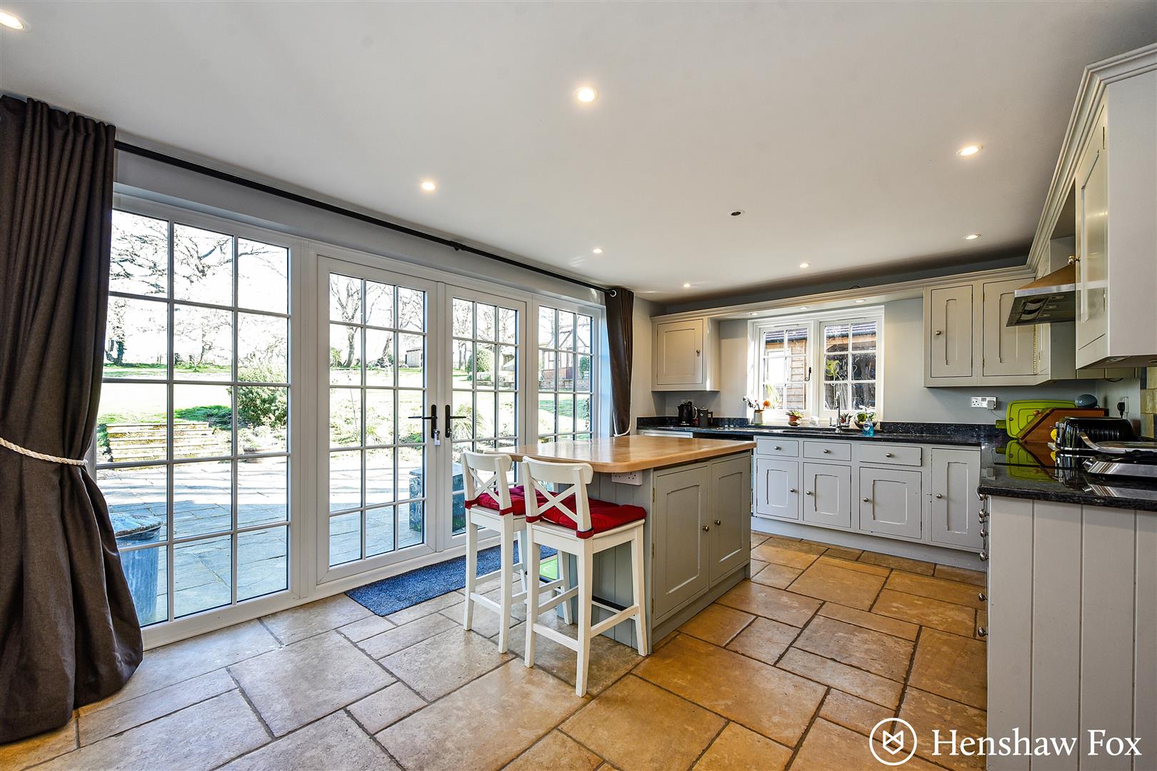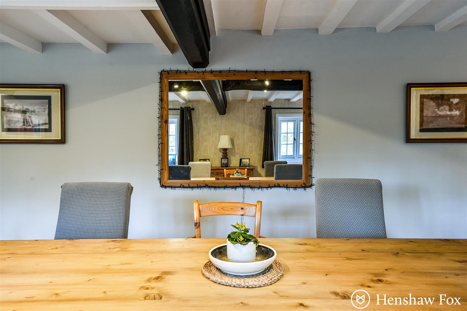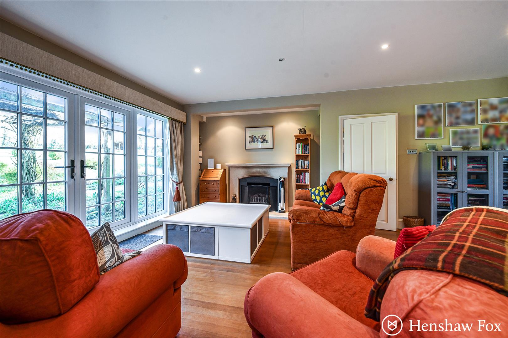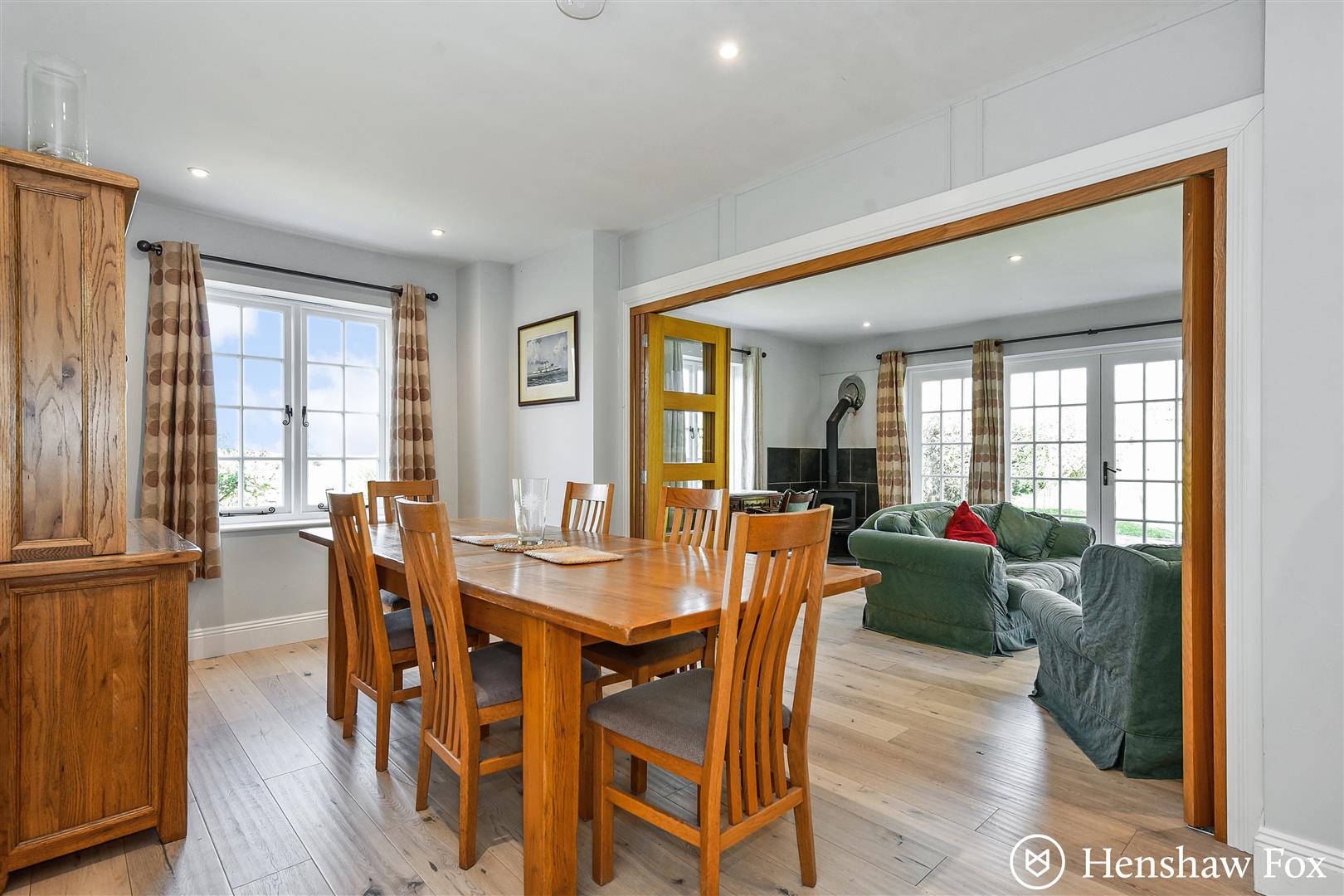 The welcoming entrance offers space for coats and shoes, fitted with quality oak effect flooring extending into the spacious dining room with feature beams and exposed brickwork. The cottage style kitchen breakfast room is flooded with light from three aspects and offers an extensive range of shaker style wall and base units with with oak and granite worksurfaces and two feature islands. Integrated appliances include an electric Aga, single oven with induction hob and extractor over, dishwasher and ample space for freestanding white goods. A family room houses the utilities cupboard with plumbing for white goods and overlooks the gardens via French doors. An inner lobby accesses a cloakroom and wc and leads to the dual aspect sitting room which features an open fireplace with bespoke fitted storage and shelving with access to the garden via French doors.