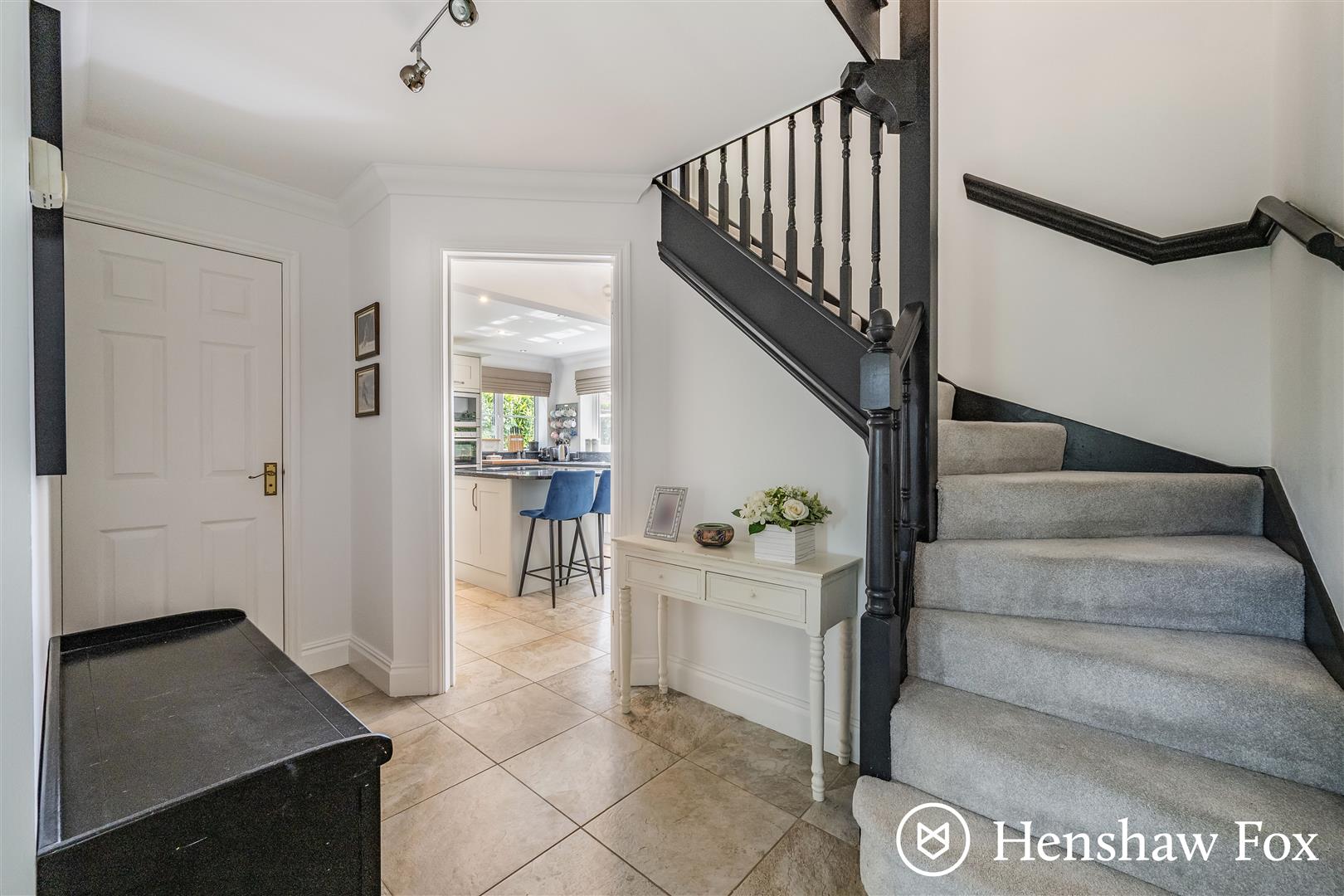 A welcoming entrance hallway provides access to all of the main living rooms on the ground floor, the ground floor WC, as well as stairs rising to the first floor. The sitting room is a generous and light-filled space, enjoying a pleasant double aspect with doors opening onto the second patio area. An open fireplace creates a warm and attractive focal point to the room. The impressive kitchen/dining/family room is fitted with a comprehensive range of soft-close cupboards and drawers. There is space for an American-style fridge/freezer, while integrated appliances include a Neff double oven, Neff microwave, Neff induction hob and a Bosch dishwasher. An opening leads through to the dining area, offering ample space for a table, chairs and additional seating, with a window overlooking the rear garden. The utility room provides space for a washing machine, a door opening directly to the garden and practical storage for shoes and coats. Completing the ground floor accommodation, the study offers an ideal space for home working.