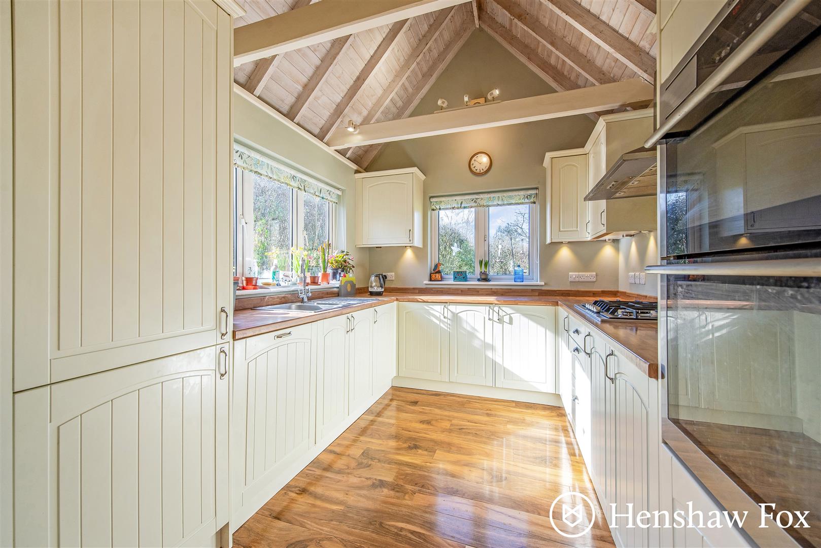 Upon entry, a welcoming and spacious entrance hall sets an immediate sense of character, giving access to the sitting room, snug, dining room, cloakroom with WC and wash hand basin, and stairs rising to the first-floor landing. To the front, the generous sitting room is filled with natural light from dual-aspect windows, with a charming log burner providing a cosy focal point and a lovely spot to unwind. The snug offers flexibility to suit modern living, whether as a playroom, reading room or a comfortable home office. To the rear, the dining area is a wonderfully bright and sociable space, enjoying triple-aspect windows and double doors opening onto the adjoining patio, perfect for entertaining and linking the indoors with the garden, while also leading to the utility room with plumbing for a washing machine, space for a tumble dryer and direct garden access. Open plan to the dining area, the kitchen features an attractive vaulted ceiling and dual-aspect windows that enhance the feeling of light and space, complemented by a range of wall and base units and integrated appliances including a double oven, hob with extractor over, fridge/freezer and dishwasher.