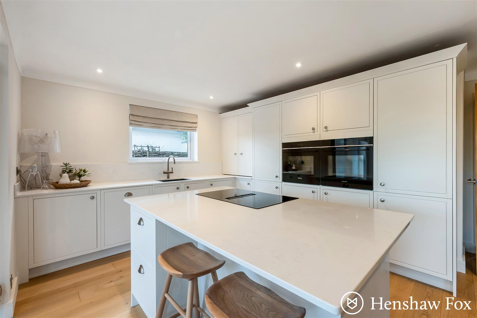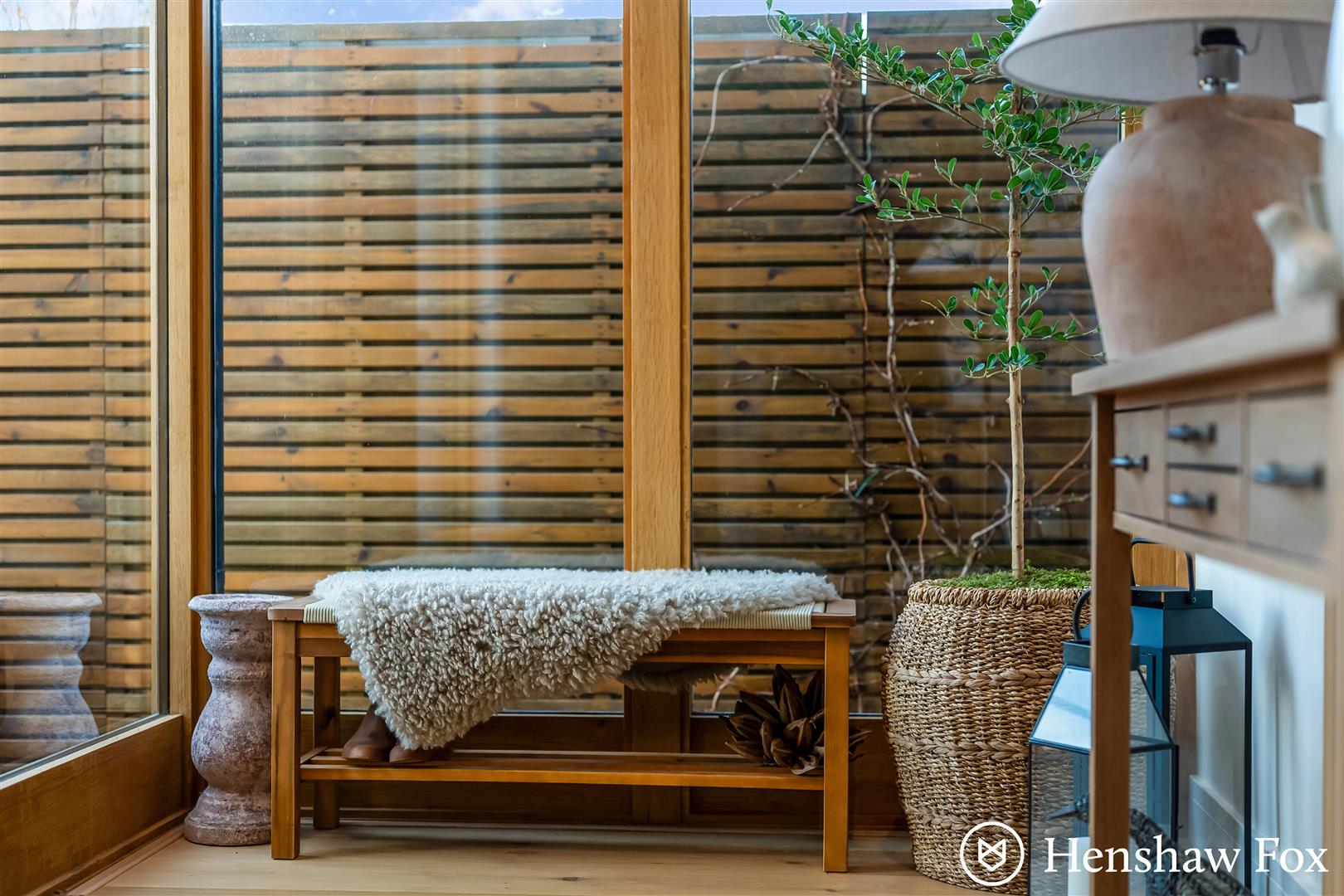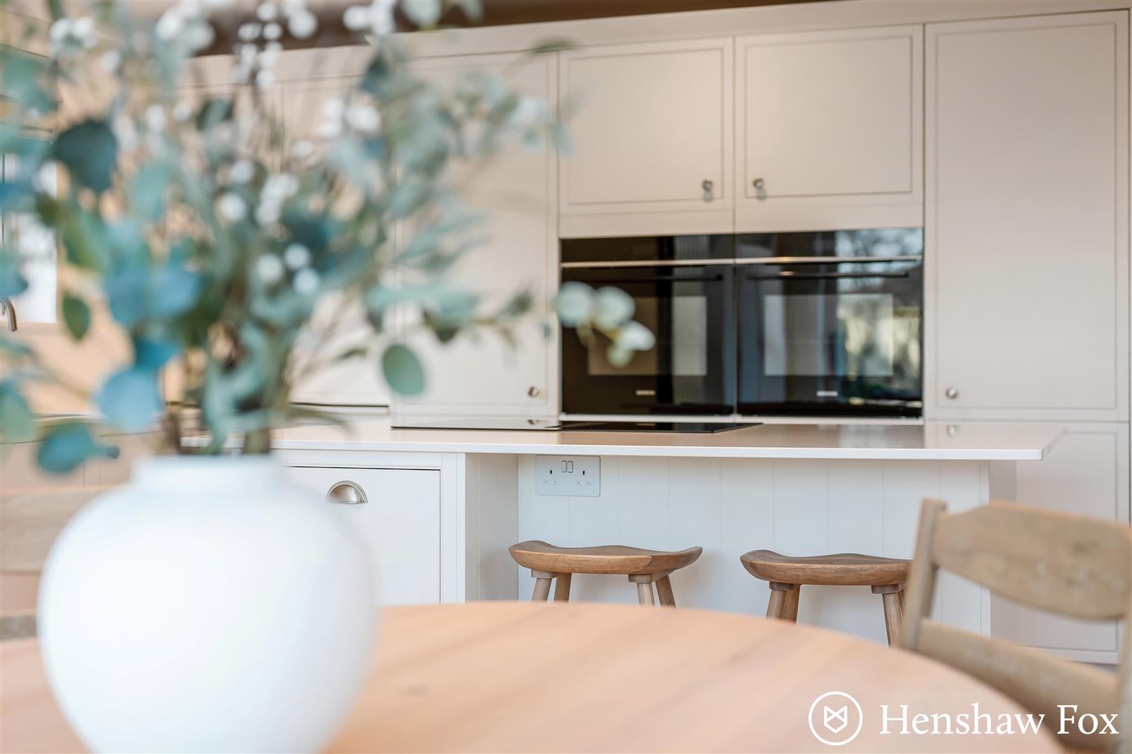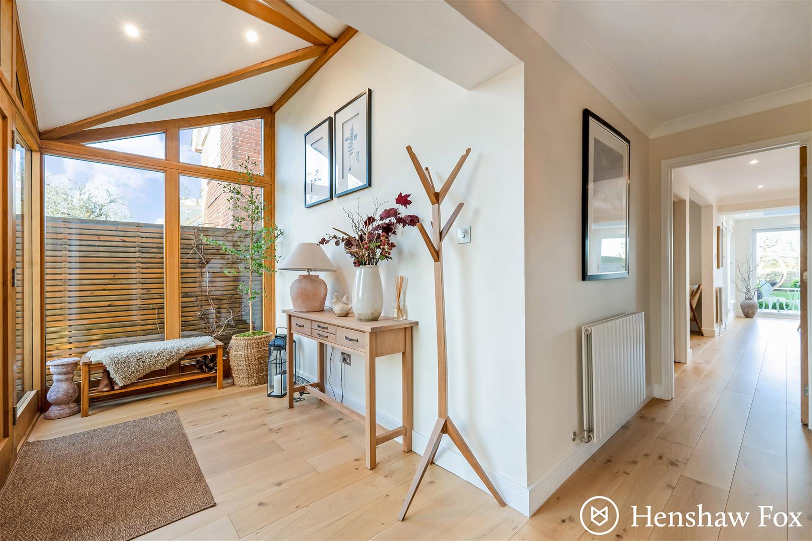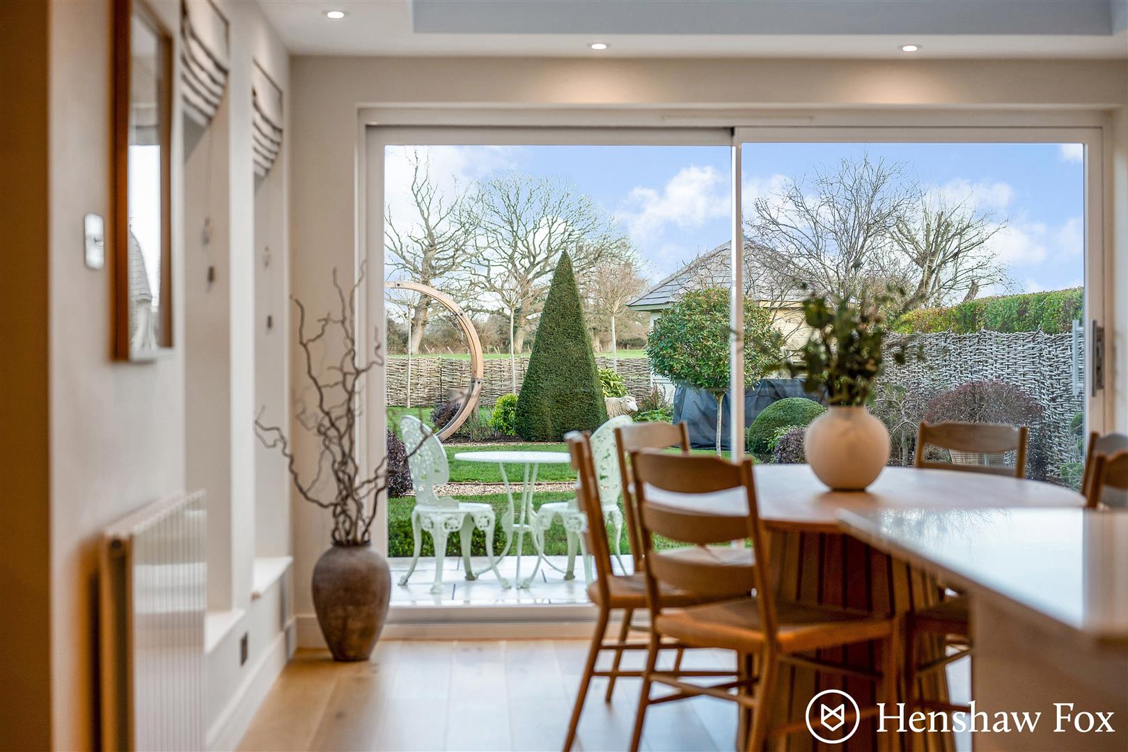 The entrance hallway is approached via a stylish oak-framed porch with floor-to-ceiling glazing and a vaulted ceiling, immediately setting the tone for this impressive family home. The welcoming hallway provides access to all principal ground floor rooms along with useful understairs storage. The sitting room enjoys a pleasant double aspect, with a fireplace forming an attractive focal point. To the rear of the home, the kitchen/dining/family room is an excellent space for both entertaining and everyday family life, perfectly suited to modern living. The contemporary kitchen is centred around a generous island with breakfast bar seating and additional storage. High-quality integrated appliances include a 'Siemens' venting induction hob, two 'Siemens' ovens, full-height 'Siemens' fridge and freezer, and a 'Bosch' dishwasher. The dining area offers ample space for a full dining suite, with sliding doors opening onto the rear garden, a roof lantern and picture windows flood the area with natural light. The laundry room is fitted with stylish cabinetry, with a utility cupboard housing the washing machine, tumble dryer, and 'Vaillant' boiler. The study/snug is a versatile space, ideal as a home office, playroom, or second sitting room, with doors opening to the side of the property.