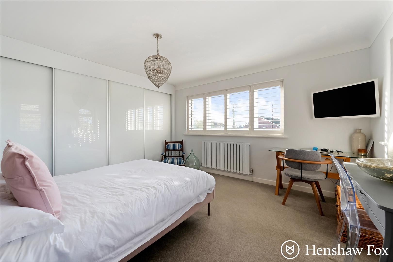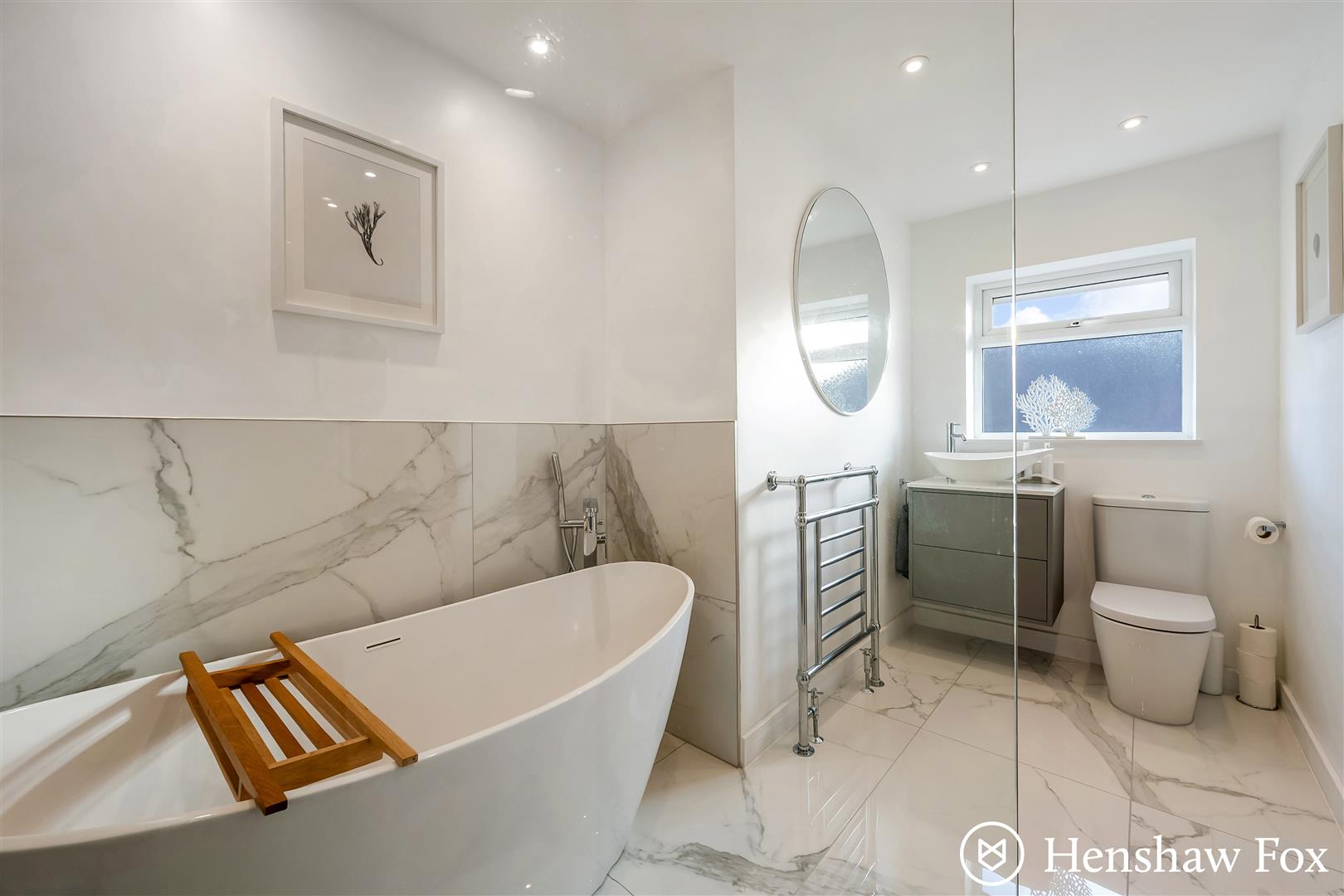 The first floor landing provides access to all four bedrooms, the family bathroom, loft space, and an airing cupboard. Bedroom one is a generous double room overlooking the rear garden, featuring wall-length built-in wardrobes and access to an en-suite shower room. The en-suite is fitted with a modern suite comprising a WC, wash basin, enclosed shower cubicle, and heated towel rail. Bedrooms two and three also benefit from built-in wardrobes, while bedroom four is a well-proportioned bedroom. The family bathroom is fitted with a stylish four-piece suite comprising a freestanding bath, walk-in shower, WC, wash basin with storage beneath, and a heated towel rail.