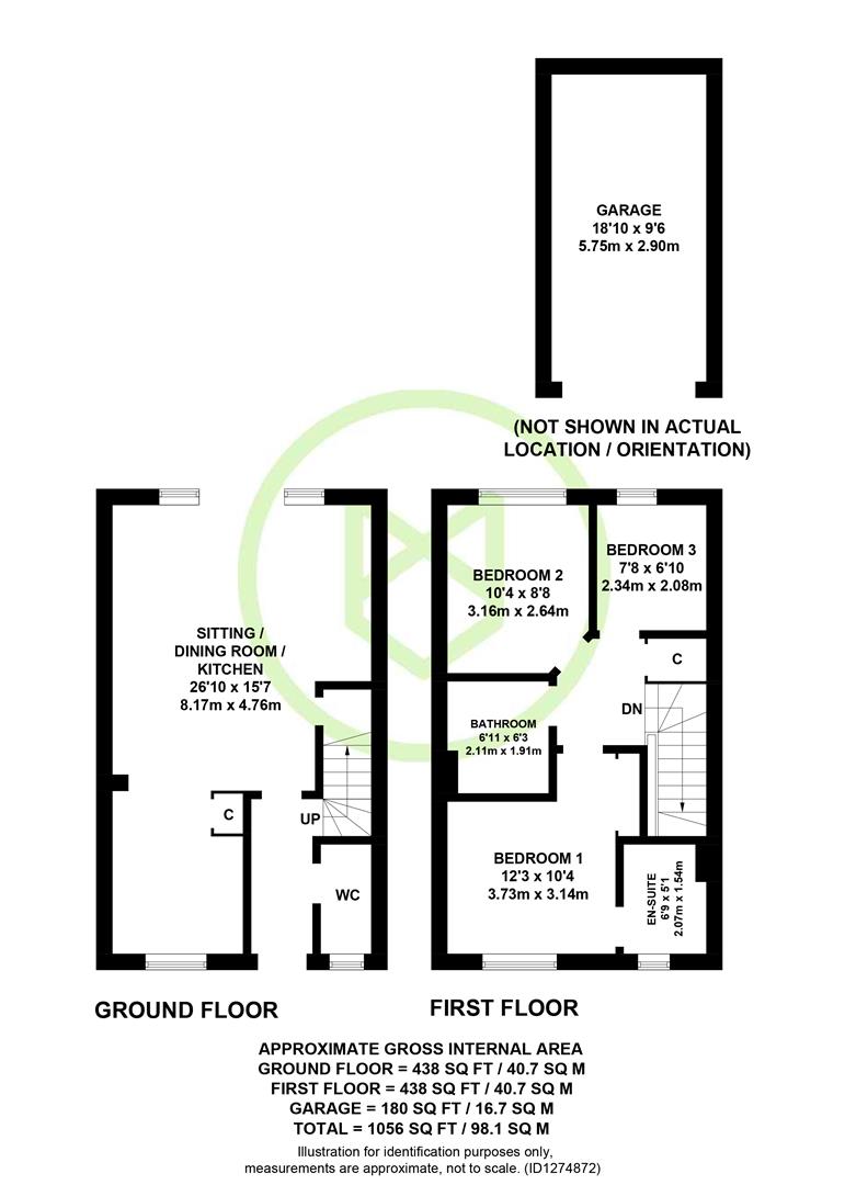 The front door opens into a welcoming entrance hall, providing access to the kitchen, sitting/dining room, cloakroom comprising WC and wash basin, and stairs to the first floor landing. The kitchen is fitted with a range of storage units and integrated appliances, with a front-facing window overlooking a green space. Positioned at the rear of the home, the sitting/dining room offers a spacious living area with double doors leading to the rear garden and a useful under-stairs storage cupboard.