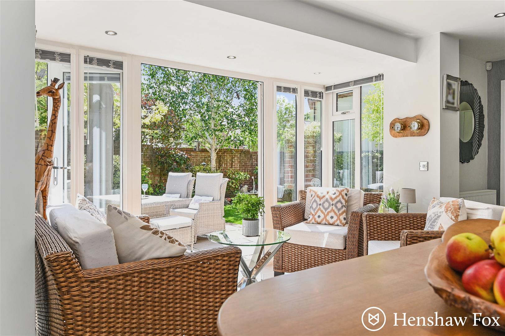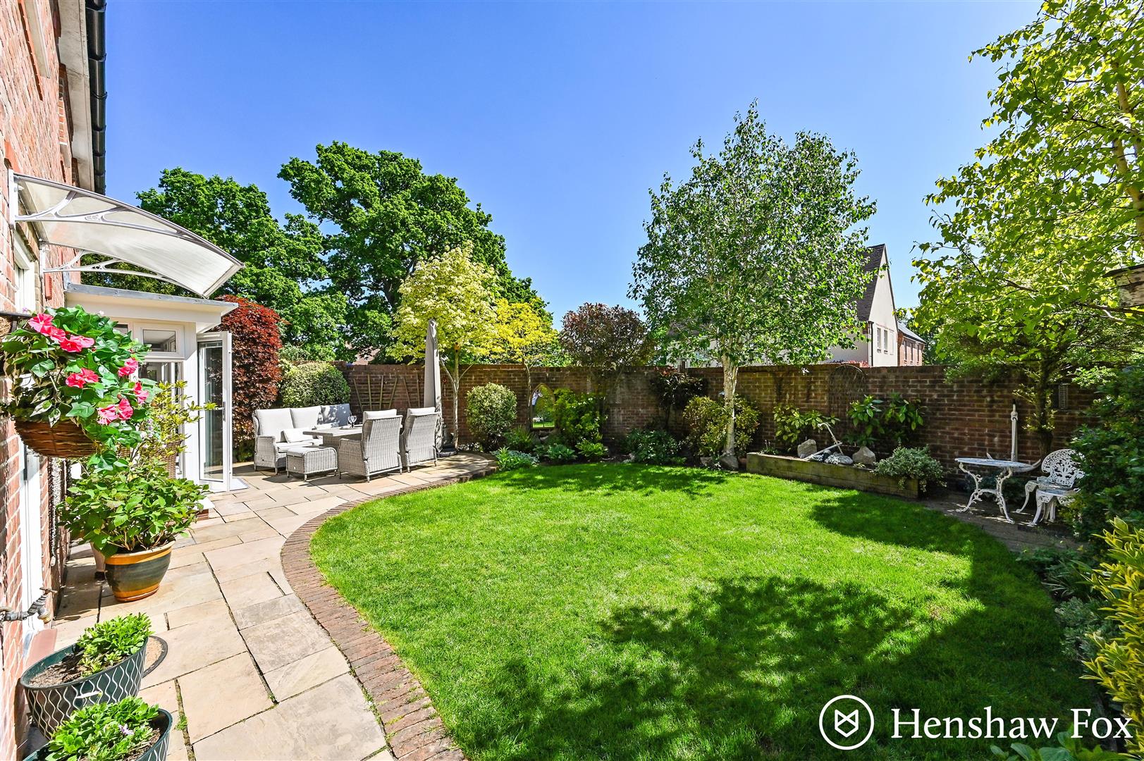Enjoying a south facing aspect, the beautifully landscaped rear garden provides an abundance of privacy allowing a quiet and tranquil retreat. It features a sweeping adjoining patio, area of well treated lawn, mature shrubs borders, variety of established trees and enclosed with a curved brick wall surround. A useful pedestrian gate allows access to the front of the home and door opens into the double garage.