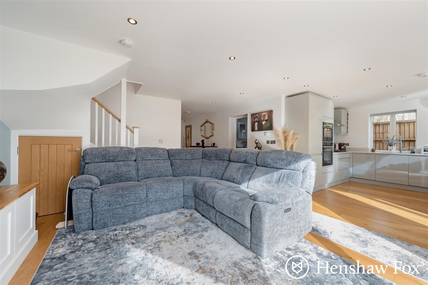The attractive covered entrance and recessed front door opens into the impressive entrance hall which flows into the stunning open plan living space with views through to the garden. Quality oak flooring extends throughout the ground floor complementing the crisp white decor. To the right, the dual aspect study/snug could be utilised as an optional fourth bedroom with a large cloakroom adjacent fitted with Roca sanitary ware with a wall mounted wash basin, wc with concealed cistern and extensive shelved storage cupboards. The impressive open plan 'live in' kitchen, dining and seating area create a fantastic social space and the hub of the home, flooded with natural light from three sets of sliding doors to the garden, as well as a glazed roof canopy. The stylish kitchen offers a range of gloss fronted wall and base units with quartz worksurfaces and breakfast bar. Integrated appliances include a single oven, microwave oven, four burner gas hob with extractor hood over, fridge, freezer and dishwasher. The seating area features a fitted dresser unit with storage under the stairs. A large utility room provides access to the garden and also to the rear of the part converted garage with additional storage, worksurface space and sink. A boiler cupboard houses the pressurised hot water tank and gas fired Worcester boiler. Other features include a rainwater harvesting system and water softener.