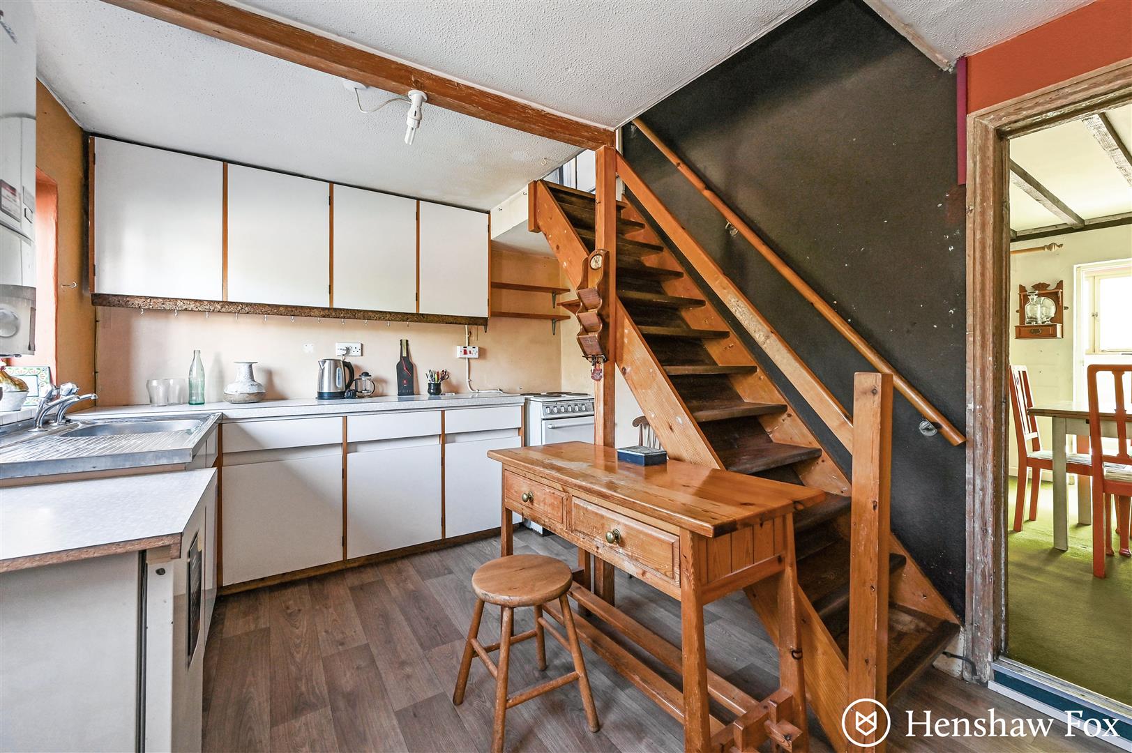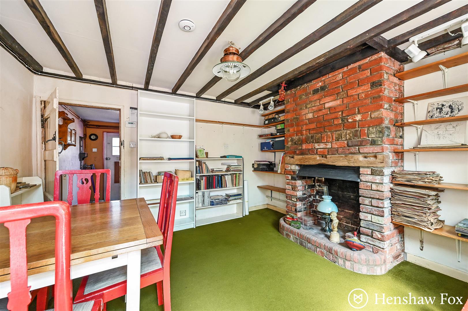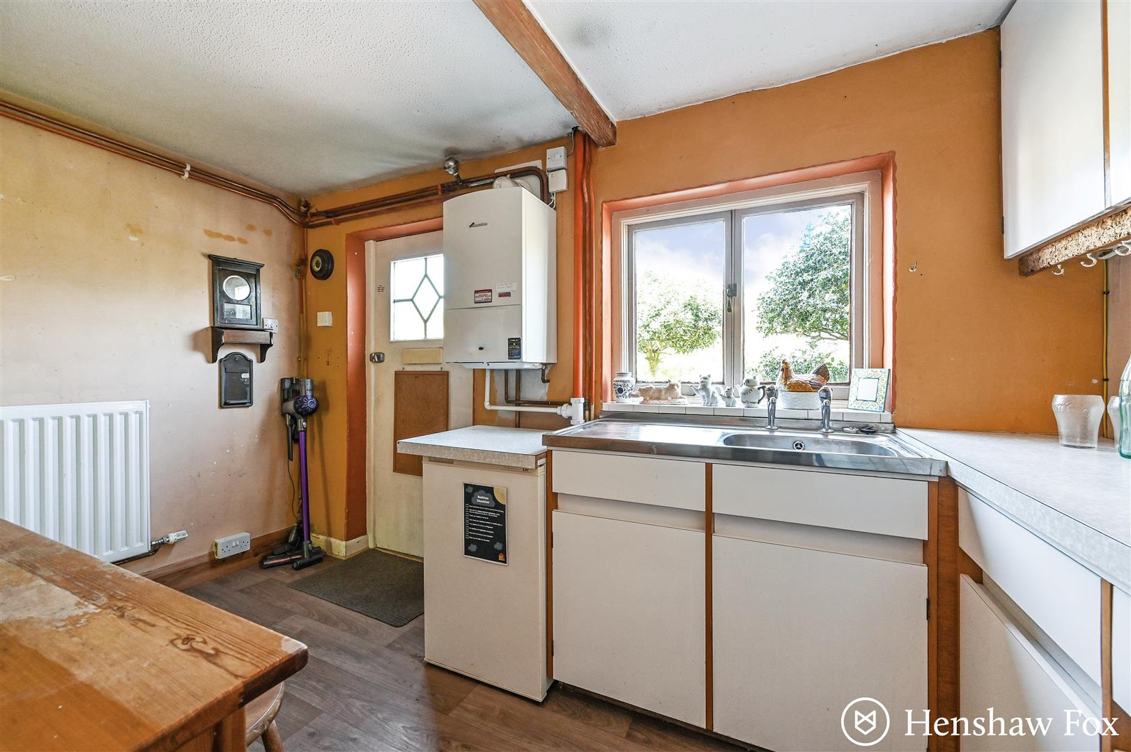 The front door opens directly into a well-proportioned kitchen, featuring a range of storage units, space for a cooker and under-counter fridge, and stairs rising to the first-floor landing. A door leads through to the spacious sitting/dining room, where a charming brick-surround fireplace serves as a focal point, creating a welcoming space for relaxation or entertaining. To the rear, a utility area provides additional storage and access to the garden via a single door, as well as a convenient downstairs WC. Character features are found throughout, adding warmth and individuality to the home.
