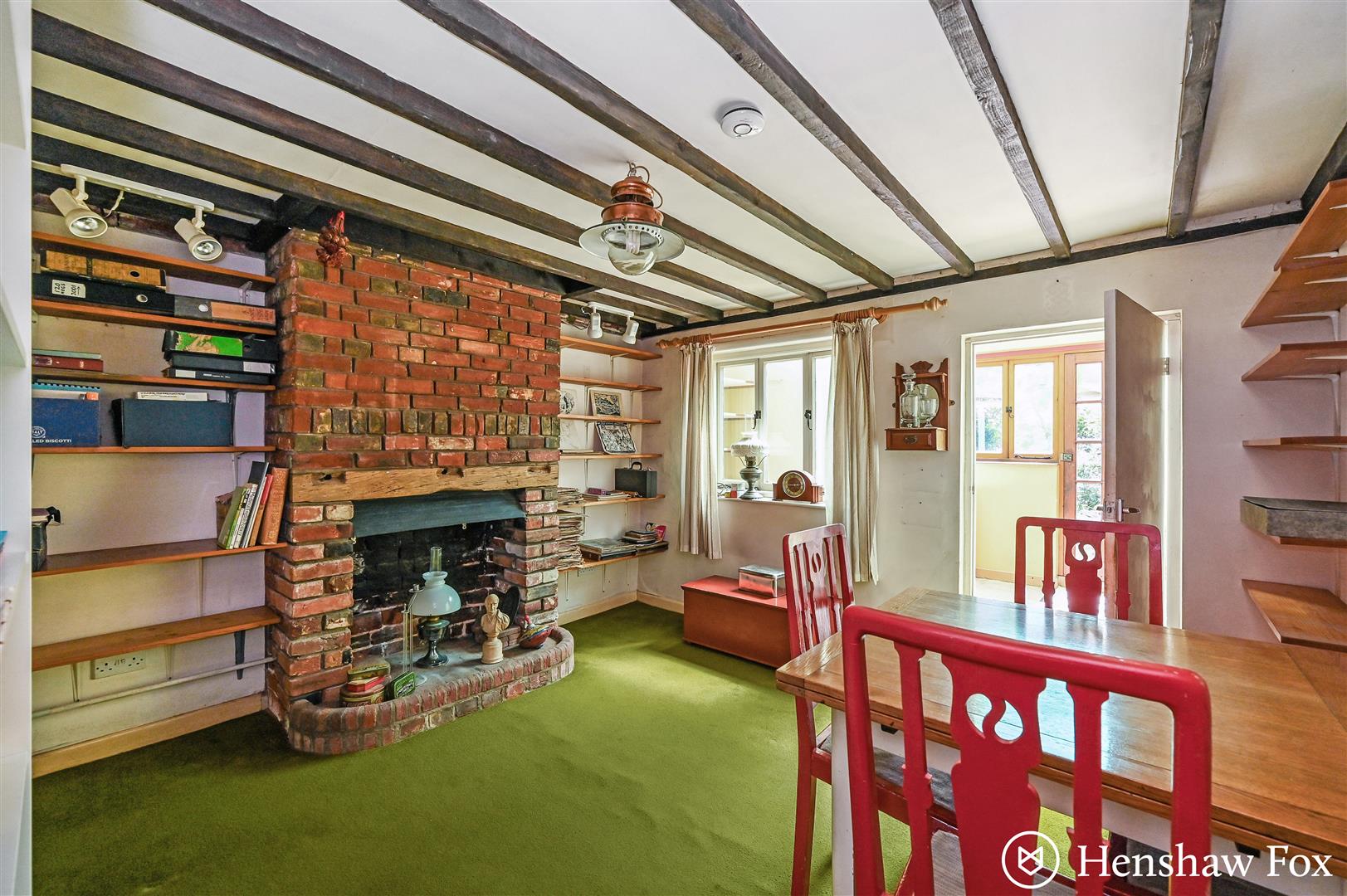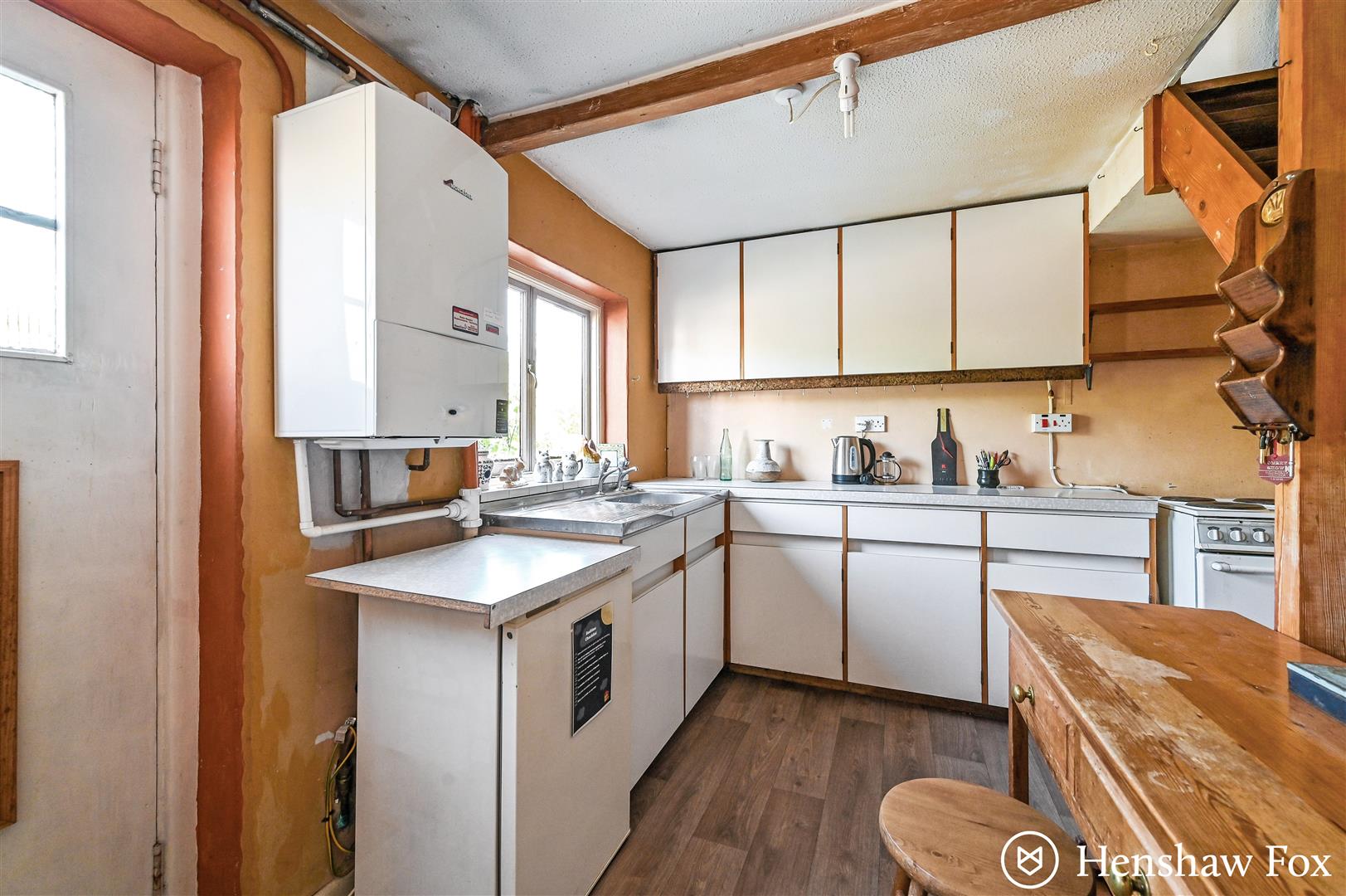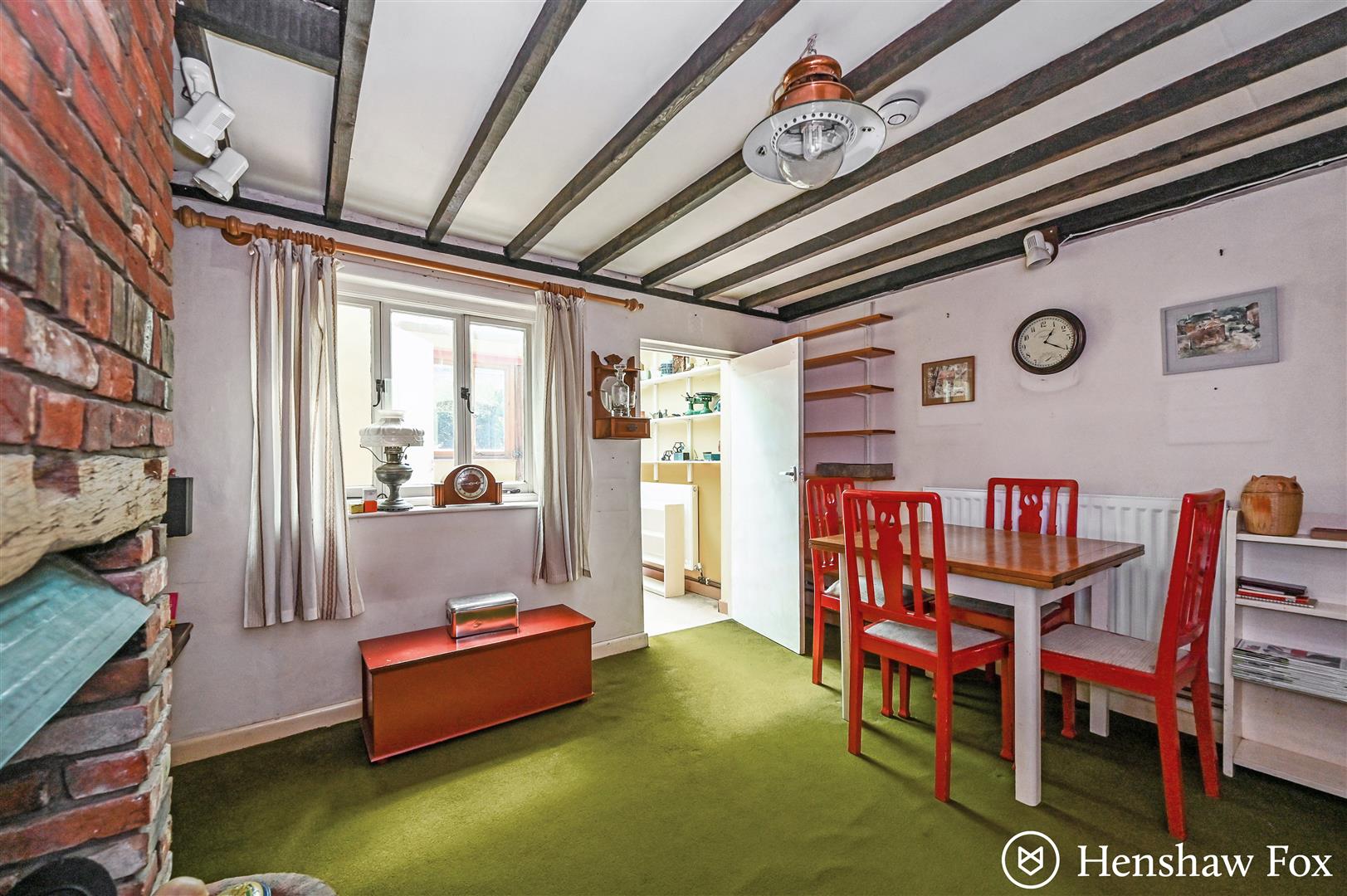 The front door opens directly into a well-proportioned kitchen, featuring a range of storage units, space for a cooker and under-counter fridge, and stairs rising to the first-floor landing. A door leads through to the spacious sitting/dining room, where a charming brick-surround fireplace serves as a focal point, creating a welcoming space for relaxation or entertaining. To the rear, a utility area provides additional storage and access to the garden via a single door, as well as a convenient downstairs WC. Character features are found throughout, adding warmth and individuality to the home.