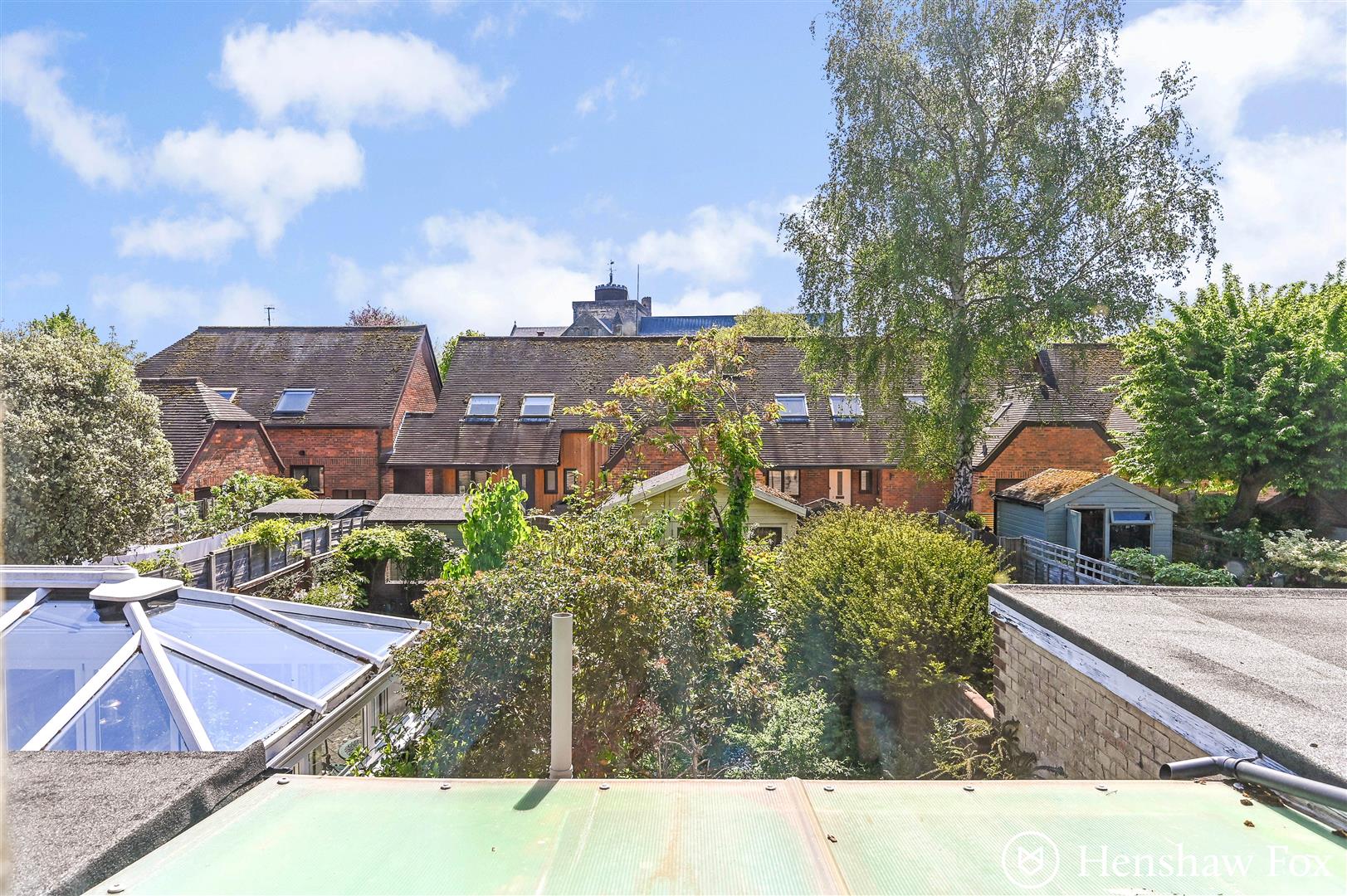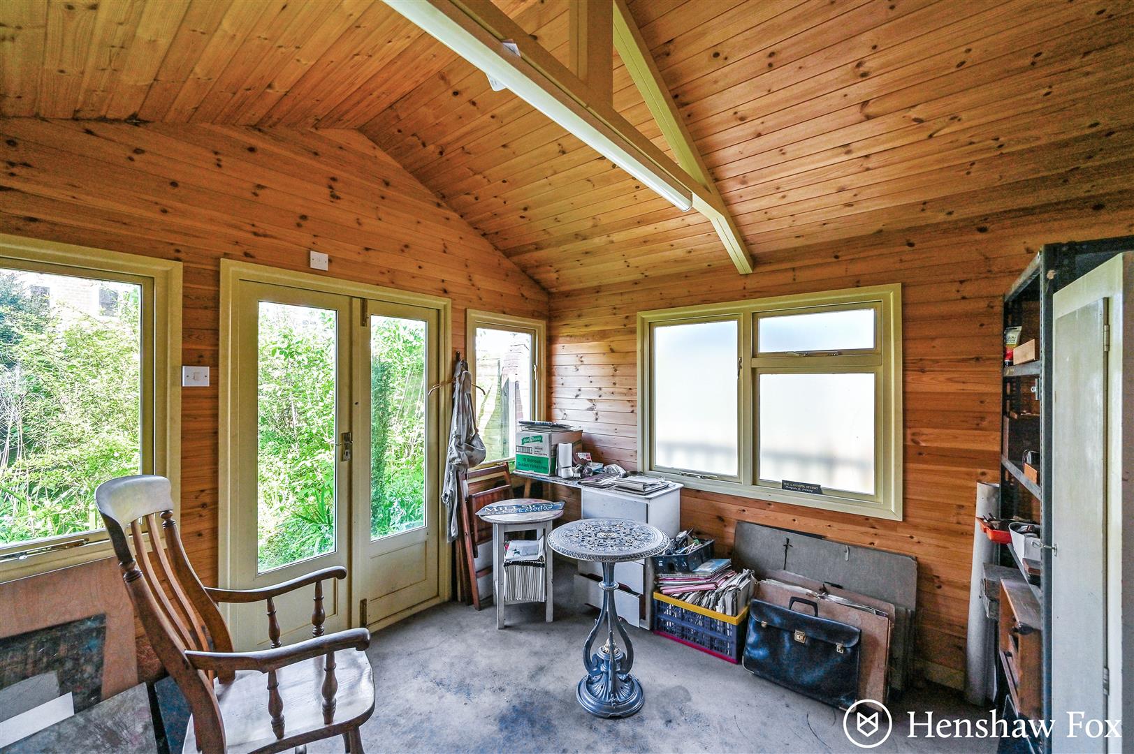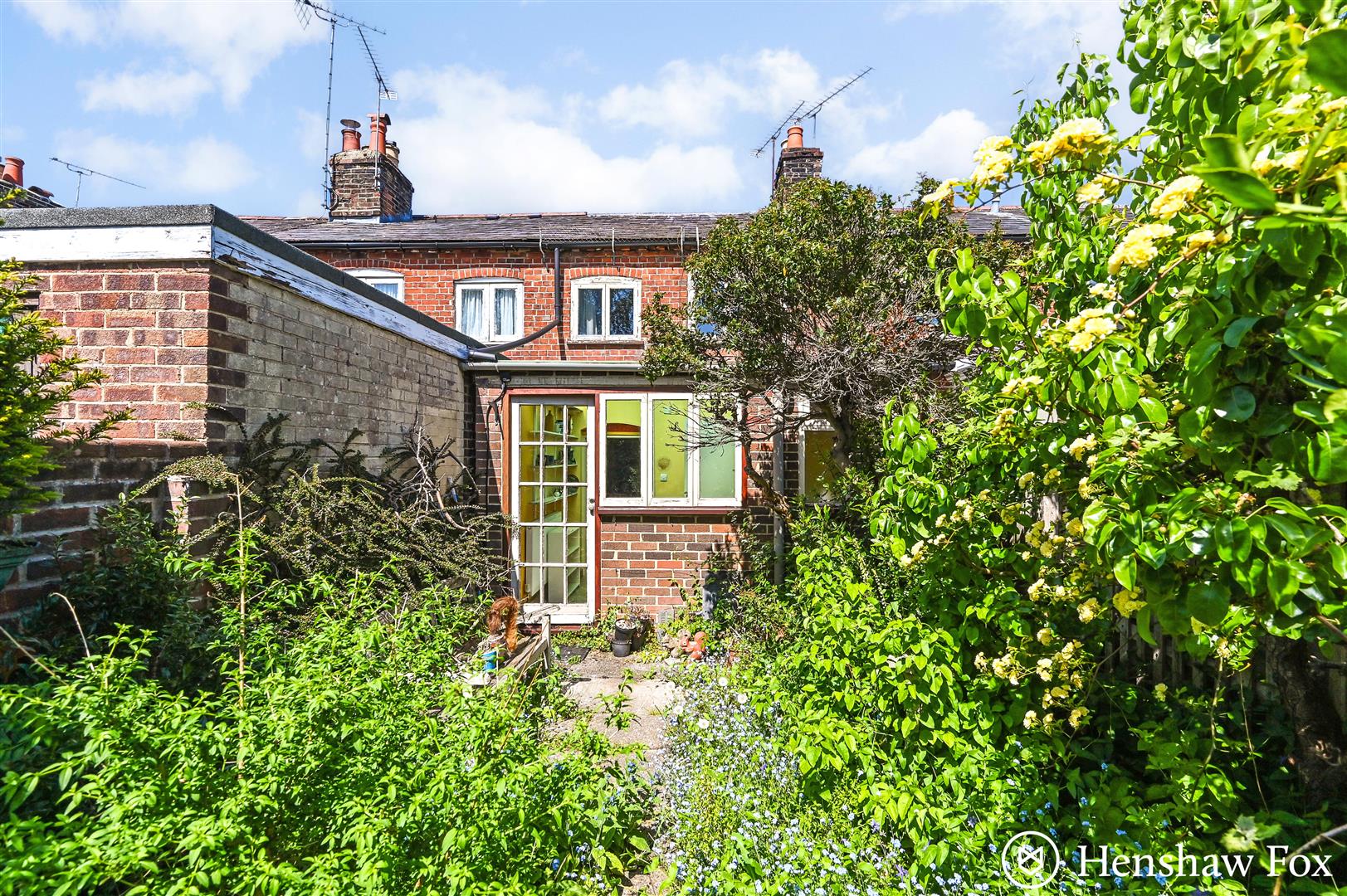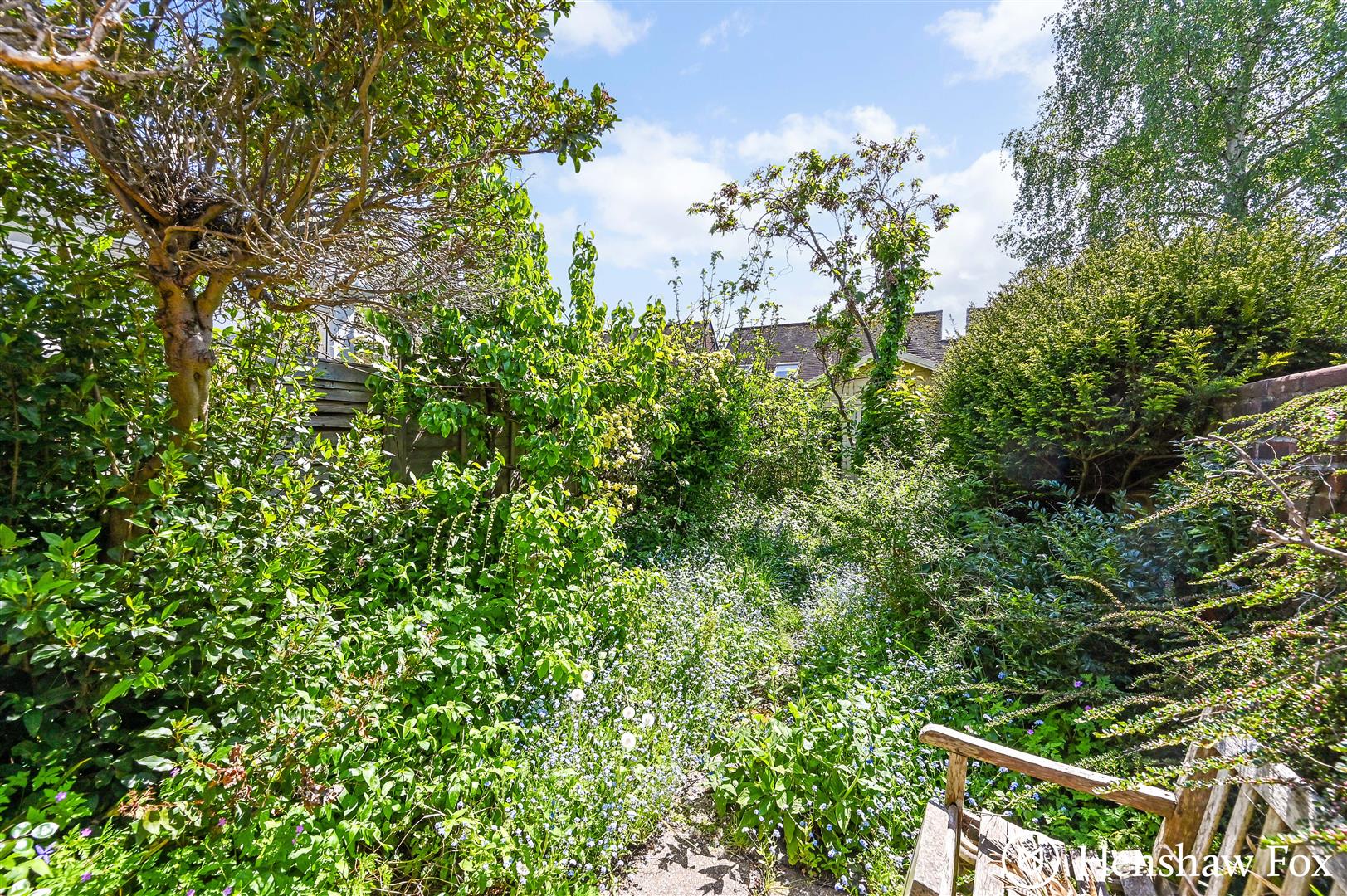 The rear garden offers a private and enclosed outdoor space, bordered on one side by a charming brick wall and on the other by timber fencing. Mature trees and an abundance of wild shrubbery create a natural, tranquil setting with a sense of seclusion. A pathway leads to a characterful summerhouse, perfect for use as a garden retreat, studio, or additional storage.