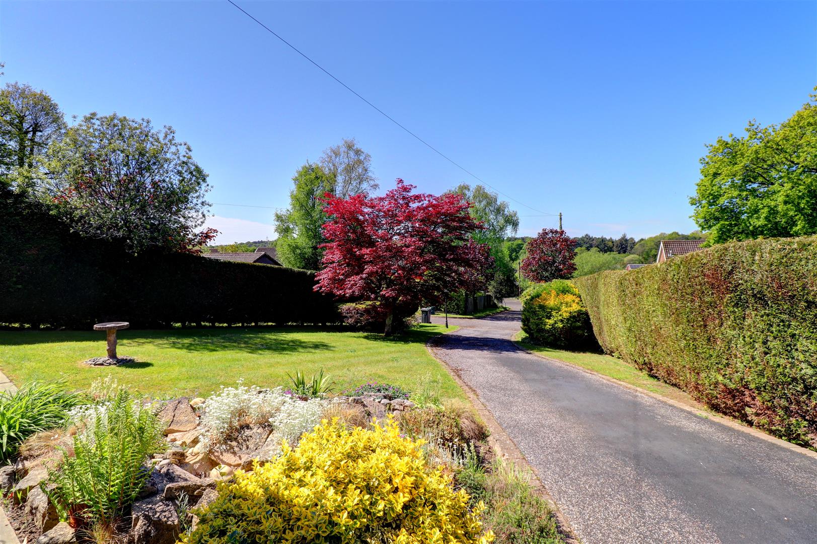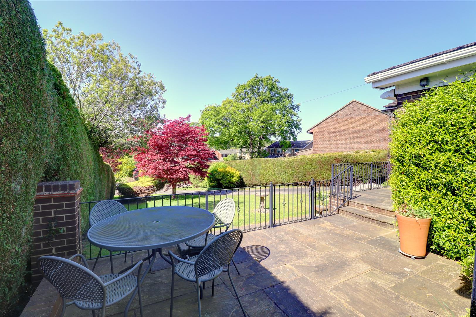 Outside, the home benefits from a raised lawn area that enjoys a desirable south-facing aspect. A charming cast iron gate leads to a secluded patio seating area, which can also be accessed via the single door from the conservatory, providing an ideal space for outdoor dining or relaxation. To the front, a well-maintained lawn flanks the driveway, complemented by a selection of mature shrubs and trees, all enclosed by private hedging that enhances the sense of seclusion. Beyond the garage lies a practical garden store, offering additional space for tools, equipment, or seasonal items.