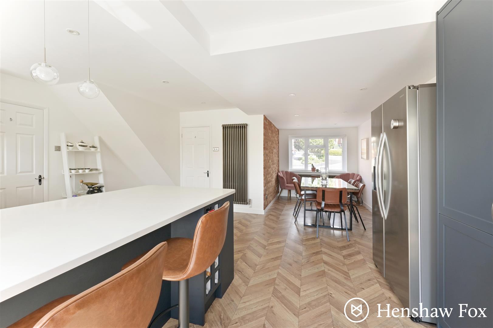 Step into a welcoming entrance hall that leads to the sitting room, a stylish open-plan kitchen/dining area, a contemporary cloakroom with WC and wash basin, and stairs rising to the first floor. Beautiful herringbone flooring flows seamlessly throughout the ground floor, adding a touch of elegance and continuity. The sitting room offers a calm and inviting space, featuring an internal door through to the kitchen/dining area and double doors that open onto a private patio, perfect for relaxing or entertaining. At the heart of the home is the expansive open-plan kitchen/dining room, a superb social space ideal for modern living. There's ample room for a large dining table and chairs, while a stylish breakfast bar provides additional seating or workspace. The kitchen is fitted with a range of sleek wall and base units, with space and plumbing for various appliances to suit your lifestyle. Double doors from this area also lead directly to the rear garden, creating a seamless indoor-outdoor connection.