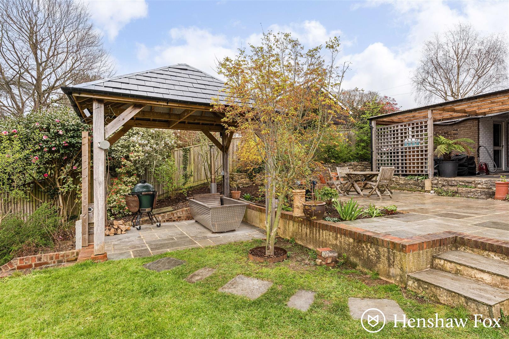 - Beautifully landscaped, tiered rear garden with patio areas, pergola, and large lawn