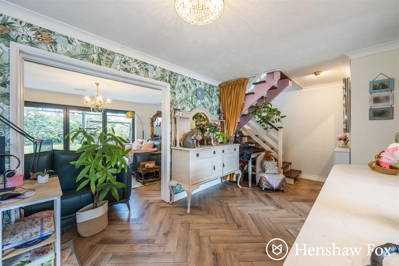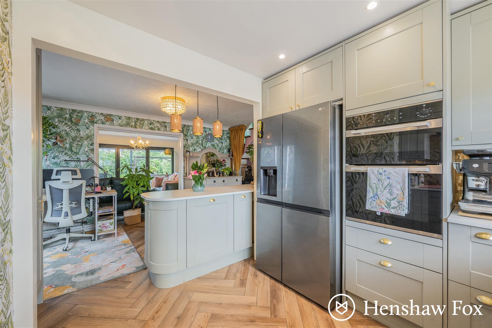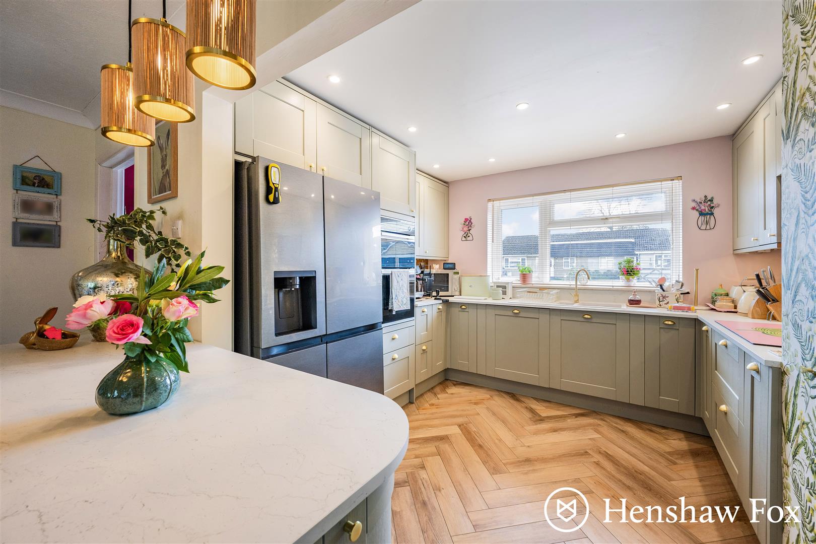 The attractive part glazed composite front door opens to the welcoming entrance hall fitted with oak effect Howdens flooring which complements the internal doors and tasteful decor. A cupboard is available for coats and shoes with a useful cloakroom adjacent with wash basin, wc and plumbing for a washing machine and dryer. The inner reception hall offers ample space for dining, with sliding doors opening to the side garden and stairs to the first floor. The open and newly fitted kitchen offers a range of shaker style wall and base units with marble effect worksurfaces and floating island. Integrated appliances include an eye level double oven, five burner induction hob with extractor hood over, dishwasher and space for an American fridge freezer. An additional cupboard houses the Worcester gas fired boiler. The generous sitting room provides ample space for seating and family dining with bi-fold doors opening to a patio seating area and enclosed garden. A wall mounted electric fire provides a focal point with a storage cupboard situated under the stairs.