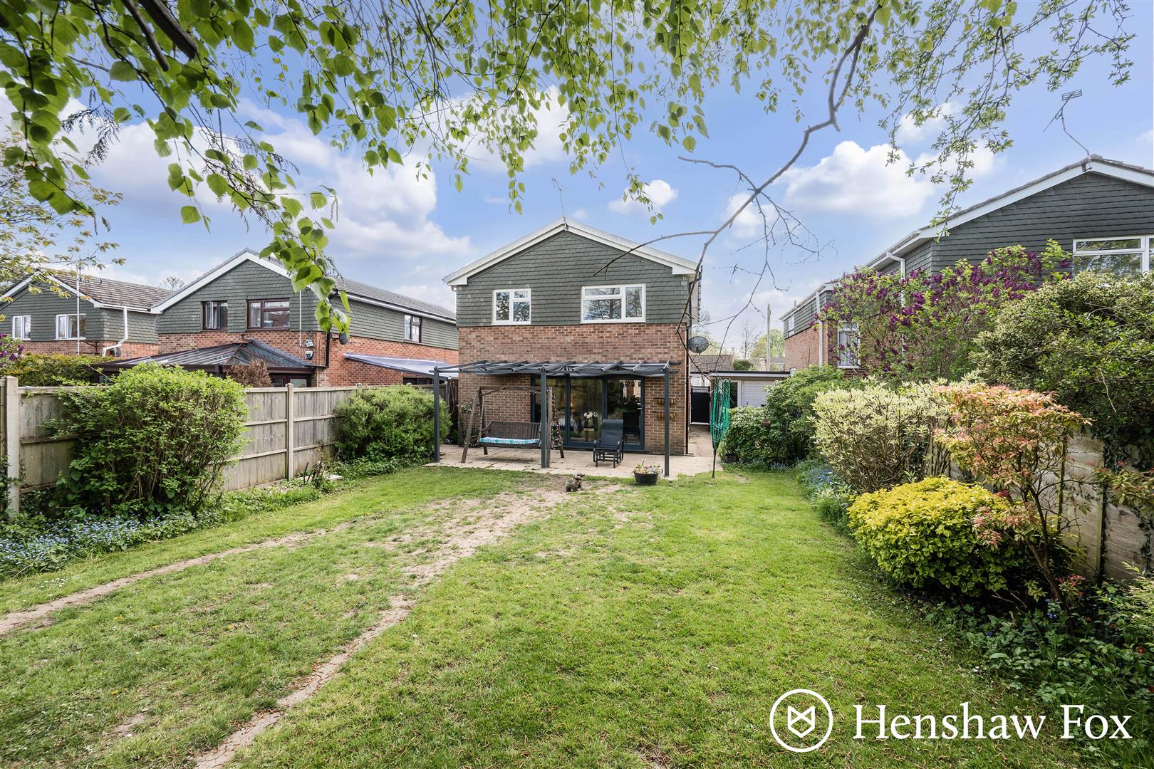A secure side gate accesses the private and enclosed rear garden with a hard standing to the rear of the garage and space for storage. A patio area abuts the rear of the property with a pergola over and retractable sun shade all overlooking the central lawn flanked by a variety of mature shrubs and small trees.
